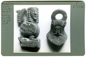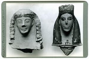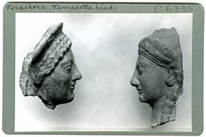 Part of the collection of images, 1930-39, of the British School at Athens excavations at Perachora, Corinthia. The original description in the SPHS register reads: "Perachora terracotta two heads". No negative listed in the SPHS register.
