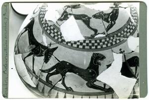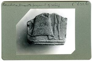 Part of the collection of images, 1930-39, of the British School at Athens excavations at Perachora, Corinthia. The original description in the SPHS register reads: "Perachora terracotta arula fragment, late 6th century". No negative listed in the SPHS register.