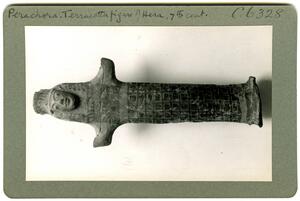 Part of the collection of images, 1930-39, of the British School at Athens excavations at Perachora, Corinthia. The original description in the SPHS register reads: "Perachora terracotta figure of Hera 7th century".