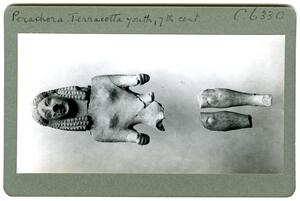 Part of the collection of images, 1930-39, of the British School at Athens excavations at Perachora, Corinthia. The original description in the SPHS register reads: "Perachora terracotta youth 7th century". No negative listed in the SPHS register.