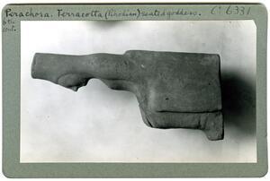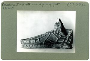 Part of the collection of images, 1930-39, of the British School at Athens excavations at Perachora, Corinthia. The original description in the SPHS register reads: "Perachora terracotta vase in form of foot, 6th century". No negative listed in the SPHS register.