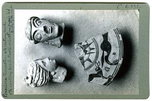 Part of the collection of images, 1930-39, of the British School at Athens excavations at Perachora, Corinthia. The original description in the SPHS register reads: "Perachora (b) 8th century head, (a) 4th century head,(c ) proto Corinthian pyxis lid, early 7th century".