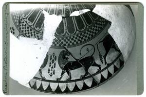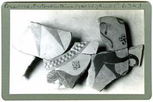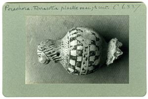 Part of the collection of images, 1930-39, of the British School at Athens excavations at Perachora, Corinthia. The original description in the SPHS register reads: "Perachora plastic vase 7th century". No negative listed in the SPHS register.