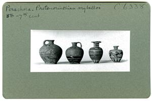 Part of the collection of images, 1930-39, of the British School at Athens excavations at Perachora, Corinthia. The original description in the SPHS register reads: "Perachora proto Corinthian aryballoi 8th-7th centuries (4)". No negative listed in the SPHS register.