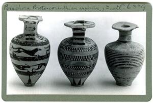 Part of the collection of images, 1930-39, of the British School at Athens excavations at Perachora, Corinthia. The original description in the SPHS register reads: "Perachora proto Corinthian aryballoi 7th century (3 larger)". No negative listed in the SPHS register.