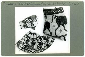 Part of the collection of images, 1930-39, of the British School at Athens excavations at Perachora, Corinthia. The original description in the SPHS register reads: "Perachora proto-Corinthian fragments 7th century". No negative listed in the SPHS register.