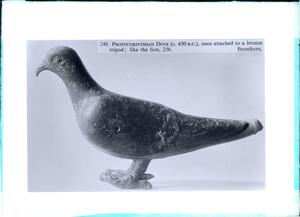 Part of the collection of images, 1930-39, of the British School at Athens excavations at Perachora, Corinthia. The original description in the SPHS register reads: "Perachora bronze dove 7th century". No negative listed in the SPHS register.