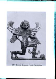 Part of the collection of images from the 1936 Exhibition of Minoan Civilization and the first 50 years work of the BSA at Burlington House, London. The object is from the 1930-39 British School at Athens excavations at Perachora, Corinthia. The original description in the SPHS register reads: "Bronze Gorgon from Perachora".