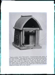 Part of the collection of images from the 1936 Exhibition of Minoan Civilization and the first 50 years work of the BSA at Burlington House, London. The object is from the 1930-39 British School at Athens excavations at Perachora, Corinthia. The original description in the SPHS register reads: "Restored terracotta model of temple, from Perachora".