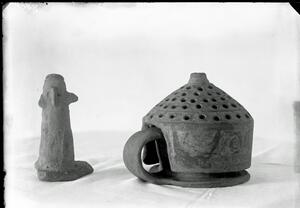 Part of a group of images from the British School at Athens excavations at Palaikastro, Crete in the 1902-1905. The original description in the SPHS negative register reads: "Palaikastro: terra cotta figurine".