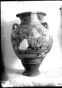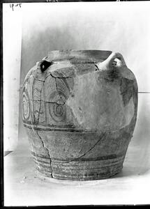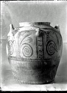 Part of a group of images from the British School at Athens excavations at Palaikastro, Crete in the 1902-1905. The original description in the SPHS negative register reads: "Palaikastro: LM III vase".