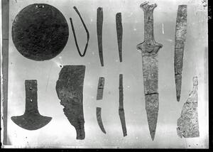 Part of a group of images from the British School at Athens excavations at Palaikastro, Crete in the 1902-1905. The original description in the SPHS negative register reads: "Palaikastro: bronze weapons".