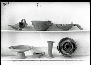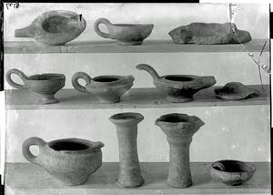 Part of a group of images from the British School at Athens excavations at Palaikastro, Crete in the 1902-1905. The original description in the SPHS negative register reads: "Palaikastro: lamps tc".