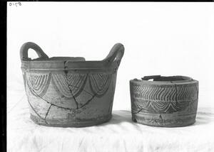 Part of a group of images from the British School at Athens excavations at Palaikastro, Crete in the 1902-1905. The original description in the SPHS negative register reads: "PK. pottery from Palaikastro: early incised bowl & stone vases".