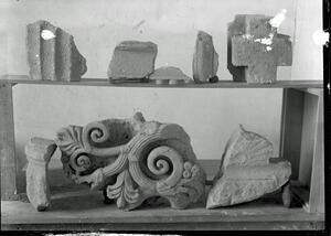Part of a group of images from the British School at Athens excavations at Palaikastro, Crete in the 1902-1905. The original description in the SPHS negative register reads: "Palaikastro: architectural fragments".