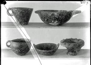Part of a group of images from the British School at Athens excavations at Palaikastro, Crete in the 1902-1905. The original description in the SPHS negative register reads: "Palaikastro: vases, miscellaneous".