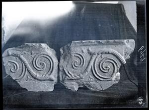 Part of the collection of images, 1906-1910, of the British School at Athens excavations at Sparta, Laconia. The original description in the SPHS register reads: "T.C. frieze, spiralform. B.S.A.".