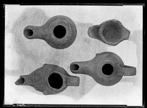 Part of the collection of images, 1906-1910, of the British School at Athens excavations at Sparta, Laconia. The original description in the SPHS register reads: "Sparta: Hellenistic lamps from tombs".