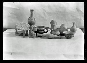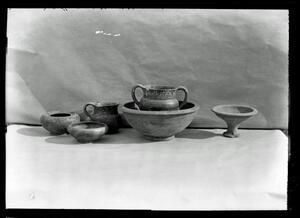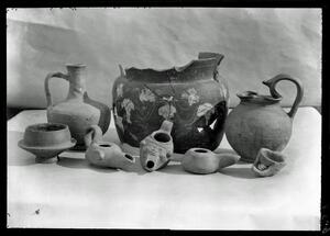 Part of the collection of images, 1906-1910, of the British School at Athens excavations at Sparta, Laconia. The original description in the SPHS register reads: "Sparta: Hellenistic vases and lamps".