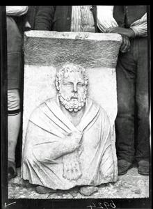 Part of the collection of images, 1906-1910, of the British School at Athens excavations at Sparta, Laconia. The original description in the SPHS register reads: "Sparta: upper part of Heracles herm from Arapissa".