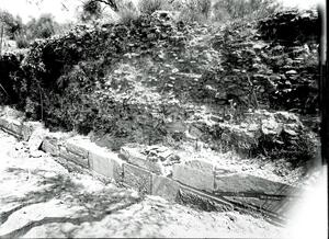 Part of the collection of images, 1906-1910, of the British School at Athens excavations at Sparta, Laconia. The original description in the SPHS register reads: "Sparta: E. end of Roman stoa (spring of Arch visible) incorporated with wall".