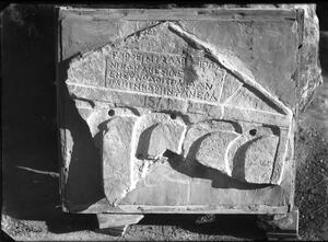 Part of the collection of images, 1924-1927, of the British School at Athens excavations at Sparta, Laconia. The original description in the SPHS register reads: "Sparta, Theatre (1926). Inscription - decree of Arcadian Orchomenos".