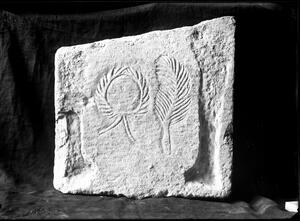 Part of the collection of images, 1906-1910, of the British School at Athens excavations at Sparta, Laconia. The original description in the SPHS register reads: "Sparta, Orthia site. Lower part of sickle dedication with wreath & palm".