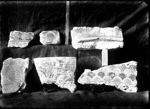 Part of the collection of images, 1906-1910, of the British School at Athens excavations at Sparta, Laconia. The original description in the SPHS register reads: "Sparta, Orthia Site 1906-10. Architectural terracottas: six pieces of disc acroterion with scale-pattern".