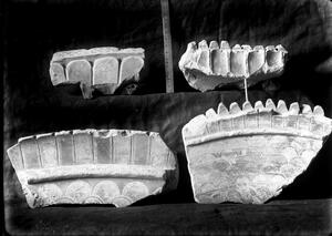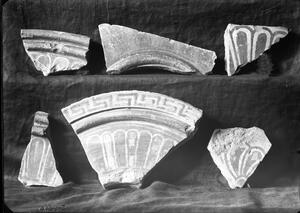 Part of the collection of images, 1906-1910, of the British School at Athens excavations at Sparta, Laconia. The original description in the SPHS register reads: "Sparta, Orthia Site 1906-10. Architectural terracottas: four pieces with tongue-pattern above".
