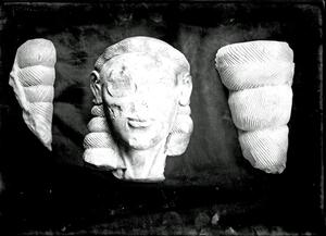 Part of the collection of images, 1906-1910, of the British School at Athens excavations at Sparta, Laconia. The original description in the SPHS register reads: "Sparta, Orthia Site 1906-10. Terracotta protome from large vase, with 'perlenprism')".