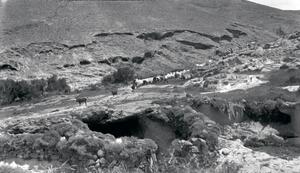 Part of a group of images from the continuation of excavations in 1910-1911 at Phylakopi on the island of Melos previously conducted by the British School at Athens from 1896-1899. The original description in the SPHS register reads: "Melos: Phylakopi. Goats returning to subterranean fold".