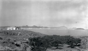 Part of a group of images from the continuation of excavations in 1910-1911 at Phylakopi on the island of Melos previously conducted by the British School at Athens from 1896-1899. The original description in the SPHS register reads: "Melos: Phylakopi. Panorama. BSA house".