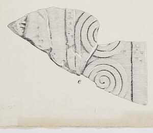 B/W ink drawing of fragment “d” from grave stele XII displaying the greater part of one spiral and a small part of another. MYC 3/4/07/1 - MYC 3/4/07/5 are glued together and represent fragments of the same stele.