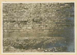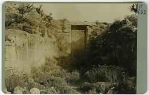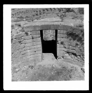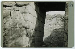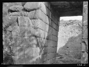 Part of a collection of images of the BSA's 1920s excavations at Mycenae. The original description in the SPHS negative register reads: "Mycenae, tholos N. of Clytemnestra's, detail of door".