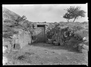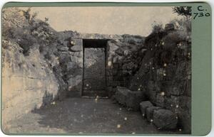 Part of a collection of images of the BSA's 1920s excavations at Mycenae. The original description in the SPHS negative register reads: "Mycenae, Lion tomb, dromos & entrance". Recorded in the register as from the 1922 season.