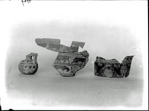 Part of the collection of images, 1906-1910, of the British School at Athens excavations at Sparta, Laconia. The original description in the SPHS register reads: "Sparta: vases, Laconian II fragments from Menelaion, Orthia fig 50, p. 79".