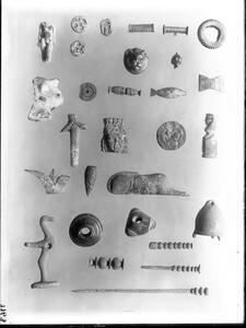 Part of the collection of images, 1906-1910, of the British School at Athens excavations at Sparta, Laconia. The original description in the SPHS register reads: "Sparta: lead figurines, Menelaion, BSA XV p.131"