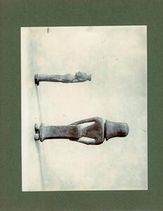 Part of the collection of images, 1906-1910, of the British School at Athens excavations at Sparta, Laconia. The original description in the SPHS register reads: "Sparta: bronze female statuette, back view and side.".