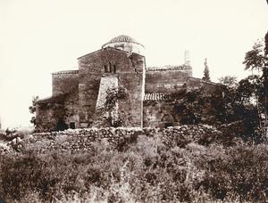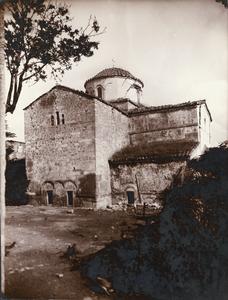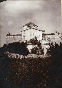 South elevation. This is a preliminary drawing in pencil. It is signed in ink, "Pieter Rodeck's work" in upper right hand (probably also by L. Alma- Tadema) and dated in pencil in the upper left-hand corner, "The Dormition of the Virgin, Skripou, Greece. Measured and drawn on the spot Sept. 1897." Further annotation in pencil survives.