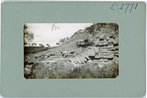 Part of the collection of images, 1924-1927, of the British School at Athens excavations at Sparta, Laconia. The original description in the SPHS register reads: "Sparta 1927, Theatre. Retaining wall, portion of outer staircase, looing W".