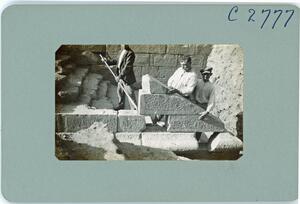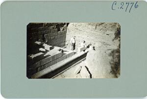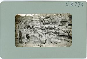 Part of the collection of images, 1924-1927, of the British School at Athens excavations at Sparta, Laconia. The original description in the SPHS register reads: "Sparta 1926, Theatre. Bastion of E. outer stairs, refitting the coping blocks".