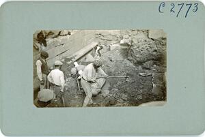 Part of the collection of images, 1924-1927, of the British School at Athens excavations at Sparta, Laconia. The original description in the SPHS register reads: "Sparta 1926, Theatre. E. Parados - cleaning the female statue".