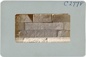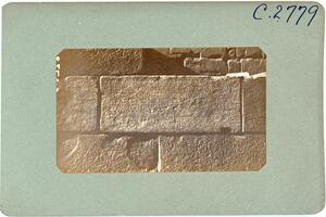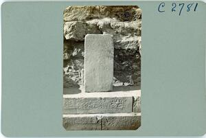Part of the collection of images, 1924-1927, of the British School at Athens excavations at Sparta, Laconia. The original description in the SPHS register reads: "Sparta 1926, Theatre. Bastion of E. outer stairs, two of the inscribed blocks in situ (larger scale)".
