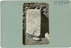 Part of the collection of images, 1924-1927, of the British School at Athens excavations at Sparta, Laconia. The original description in the SPHS register reads: "Sparta 1926, Theatre. Statue base of Julius Charixenos".