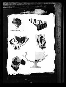 Part of the collection of images, 1924-1927, of the British School at Athens excavations at Sparta, Laconia. The original description in the SPHS register reads: "Sparta 1927, Acropolis. Pottery. Laconian: eleven figured fragments, incl. 2 with Gorgoneion".