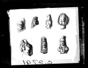 Part of the collection of images, 1924-1927, of the British School at Athens excavations at Sparta, Laconia. The original description in the SPHS register reads: "Sparta 1926, Acropolis. Seven archaic terracotta heads, etc.".