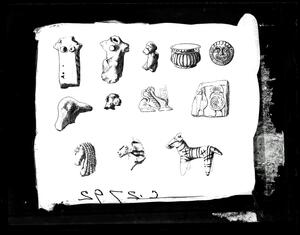 Part of the collection of images, 1924-1927, of the British School at Athens excavations at Sparta, Laconia. The original description in the SPHS register reads: "Sparta 1926, Acropolis. Miscellaneaous archaic terracottas, including warrior plaque, sphinx and animals".