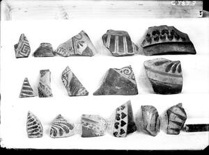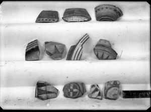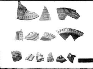 Part of the collection of images, 1924-1927, of the British School at Athens excavations at Sparta, Laconia. The original description in the SPHS register reads: "Sparta 1926, Acropolis. Various decorated Laconnian III-V sherds".