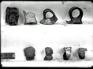 Part of the collection of images, 1924-1927, of the British School at Athens excavations at Sparta, Laconia. The original description in the SPHS register reads: "Sparta 1924-27, Acropolis. Pottery, Laconian II. Handles and protomai".