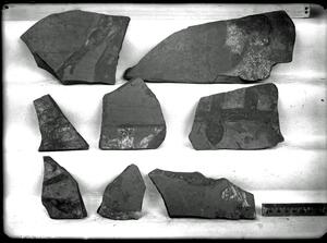 Part of the collection of images, 1924-1927, of the British School at Athens excavations at Sparta, Laconia. The original description in the SPHS register reads: "Sparta 1924-27, Acropolis. Pottery, Laconian (?) 2 fragments of black-glazed ware with figures in added white".
